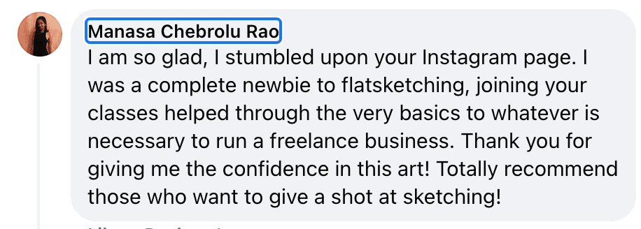 "I went through your 3-day workshop & I liked the content. I decided to join the academy at once. I'm very satisfied". She says that she was good at hand sketches but she did not know how she can create digital flat sketches but now she can convert her creative ideas into digital sketches.