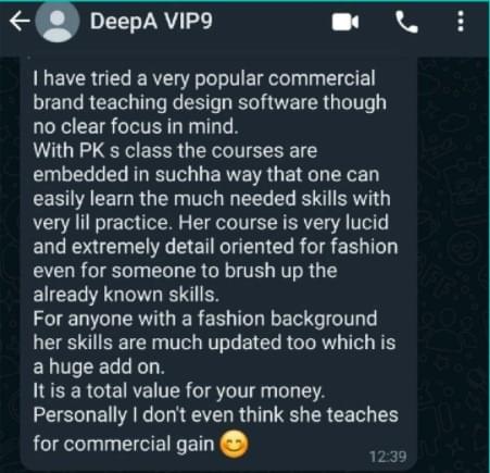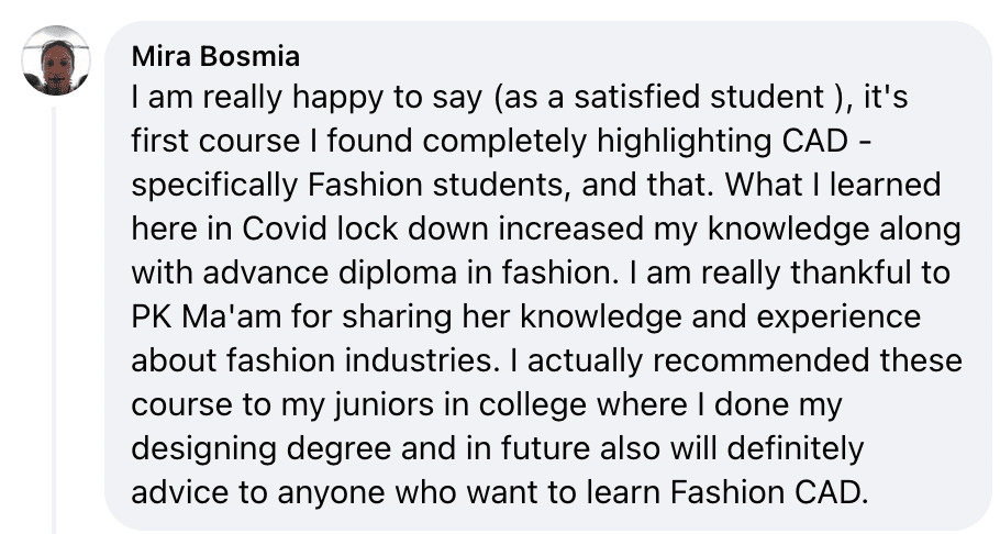 She says that many institutes teach these software but they aren't precise. They teach you excel or illustrator or photoshop but they don't teach how it is applied in fashion industry. I've learnt that missing part through your course. I have also recommended this course to my peers.